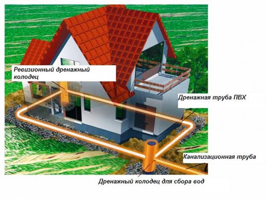 Дренажная система своими руками представлена канавами замкнутого вида с расположенными в них дренами. Вода стекает по трубам, которые расположены под наклоном до 2 ⁰ C. По углам и на прямых участках расположены ревизионные колодцы. Для защиты от инфильтрации вод между домом и дренами прокладывают глиняный замок.
