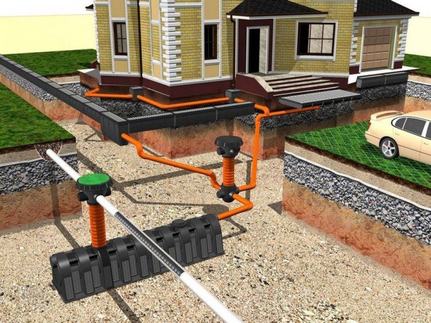 Дренажная сеть отводит воду по трубам в накопительный или дренажный колодец. Ливневая система предполагает сначала попадание воды со всех собранных поверхностей в коллектор, а оттуда, по собственной магистрали труб (дренаж и ливневка в одной трубе