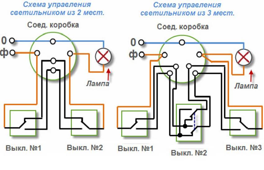 Если управление освещением планируется из большего количества мест, в общую схему вводятся дополнительные перекрестные переключатели, которые присоединяются по вышеизложенному принципу.