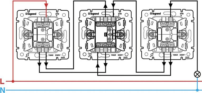 Схема подключения проходных выключателей с трех мест будет выглядеть следующим образом: