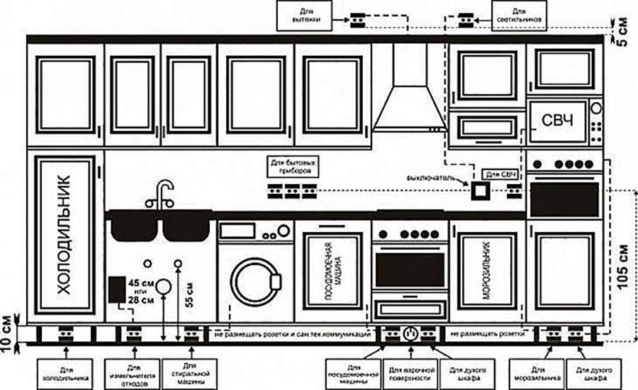 - отдельные линии для мощной техники (духовка, посудомоечная машина, варочная панель);