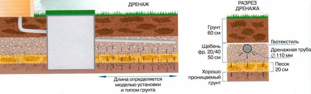 Затем устраивают места для дренажных колодцев. В дальнейшем на дно траншей простилают геотекстиль, за ним слой щебня, укладывают дрены, монтируют колодцы и заводят дрены в них. Обустраивают накопительные колодцы. Трубы засыпают щебнем и оборачивают геотекстилем. Сверху загружают смесь щебня и песка, присыпают грунтом.