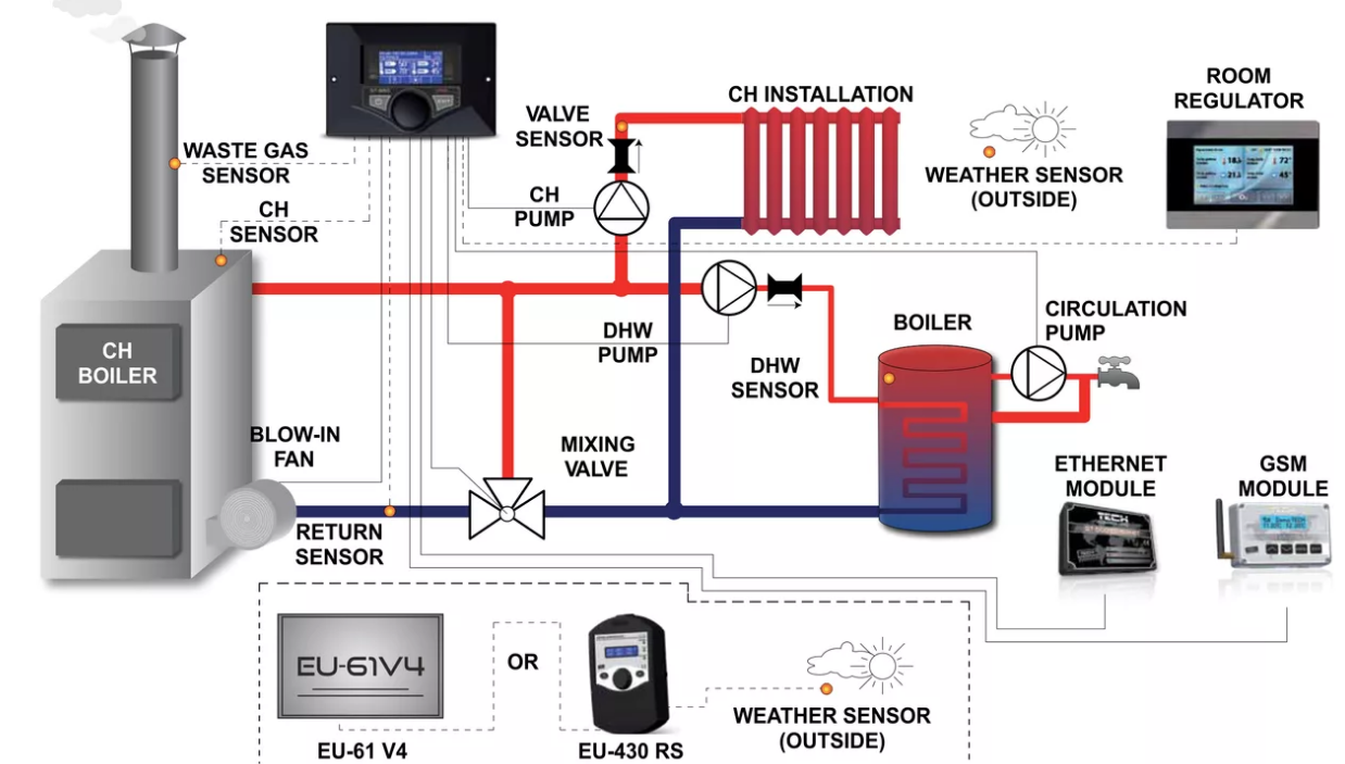 Основная схема управления климатом и котлом в умном загородном доме будет зависеть от того, каким образом формируется сеть из теплообменников, которые подключаются к блоку. Также важен функционал датчика управления.