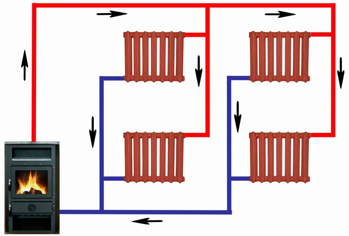 Двухтрубная схема системы отопления частного дома с естественной циркуляцией делается с использованием подающего и отводящего трубопровода, то есть все радиаторы подключаются к разводке параллельно, что способствует равномерному прогреву каждой комнаты и всего дома.