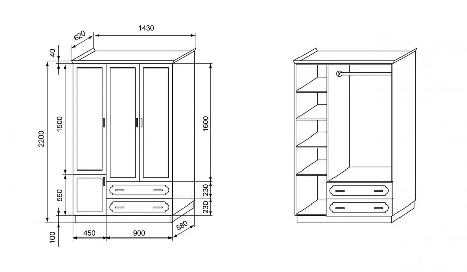 - Распашной шкаф с зеркальными дверцами (фасад полностью зеркальный или совмещенный с основным материалом).