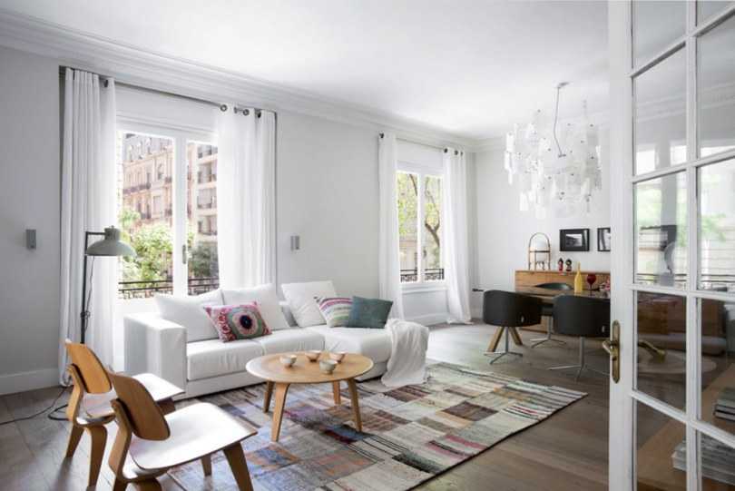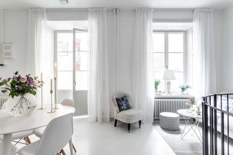 - Оттенки белого. Нужно сказать, что белый —это основной цвет нордического стиля оформления интерьера. Это некий символ чистоты и элегантности. Такие ткани легко пропускают рассеянный солнечный свет, делая комнату более просторной и светлой. Занавески, выполненные в белом цвете идеально подойдут для компактной гостиной, столовой либо кухни;