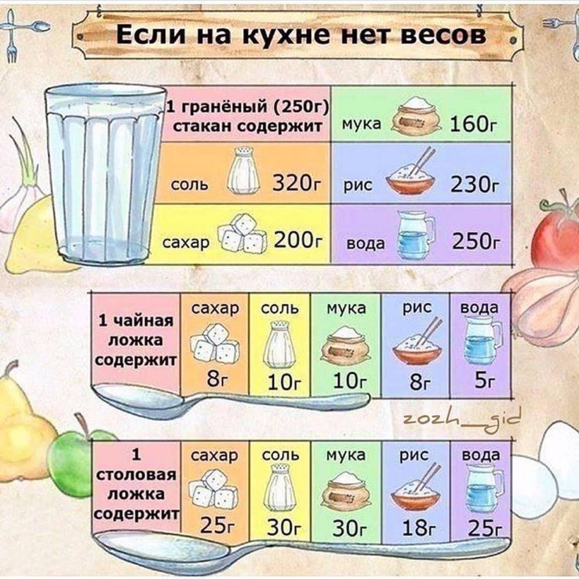 Если, например, в рецепте сказано, нужно взять стакан муки, то количество грамм можно взвесить, сколько муки туда поместится. Но во многих рецептах указано, что нужно именно определённое количество в граммах, а когда под рукой весов не будет, придётся измерять ёмкостями, что есть на кухне. Существует специальная таблица, которая указывает количество грамм продукта в еёмкости.