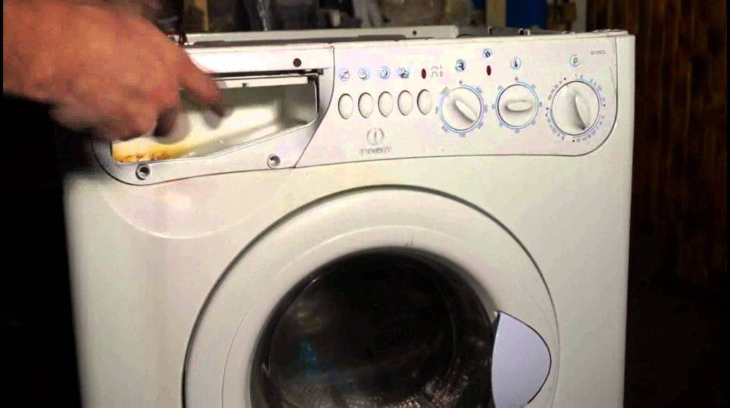 Достаём контейнер дозатора. Затем убираем цокольную панельку, ослабляем хомут, фиксирующий манжетку дверцы, и открепляем манжетку от стенки дверцы. Затем снимается фильтр сливной помпы (предварительно также надо подготовить тряпку и ведро). После того, как вытечет остаточная вода, снимается передняя часть панели. Для этого отвёрткой скручиваются саморезы. Низ стенки панели надо двигать на себя до тех пор, пока не образуется щель в 5 см. Туда просовываем руку, и наощупь ищем устройство блокировки люка. От него открепляем разъём с проводами. После этого тянем на себя панель и снимаем её.