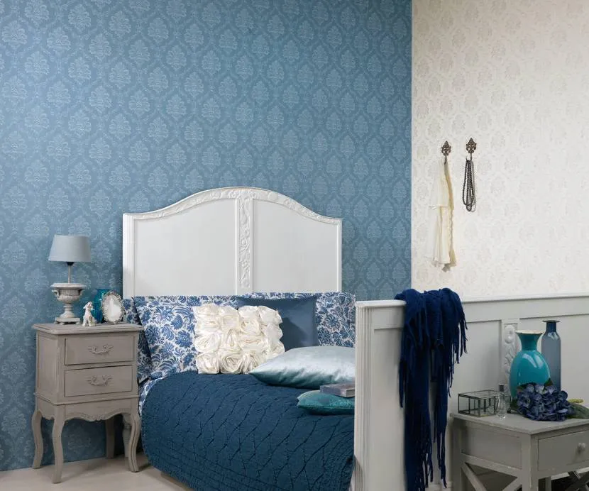 Небесно-голубой, бирюзовый, глубокий синий, васильковый – все эти оттенки успокаивают нервную систему человека, способствуют релаксации. Еще один немаловажный плюс: оттенки синего быстрее погружают спальню во тьму, ускоряя время засыпания. Не стоит забывать и о том, что холодные тона расширяют пространство, увеличивают его визуально. Это значит, что синие и голубые обои для небольшой спальни просто незаменимы. К тому же они «охладят» помещение, расположенное на солнечной стороне.