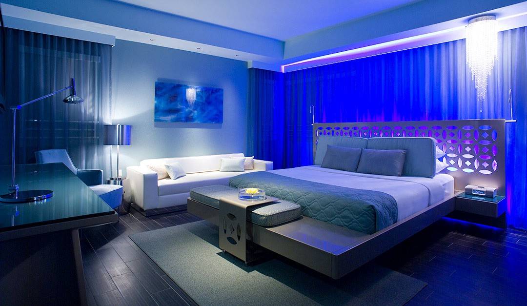 Холодный голубой цвет стен с интересной подсветкой поолка и стен