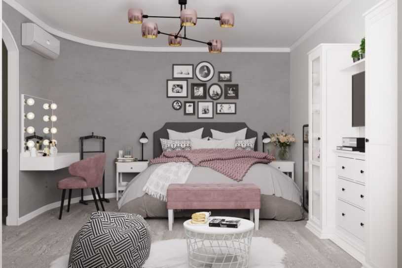 Строгость серого оттеняется мягкостью розового. Не стоит выбирать оттенки а-ля фламинго, смотрите на сложные тона. Жемчужный серый прекрасно сочетается с пудровым, графитовый – с пепельно-розовым, а на светло-сером фоне будут отлично выделяться акценты цвета фуксии. Чтобы не превратить комнату в девичью келью, розовых акцентов должно быть не более 30%.