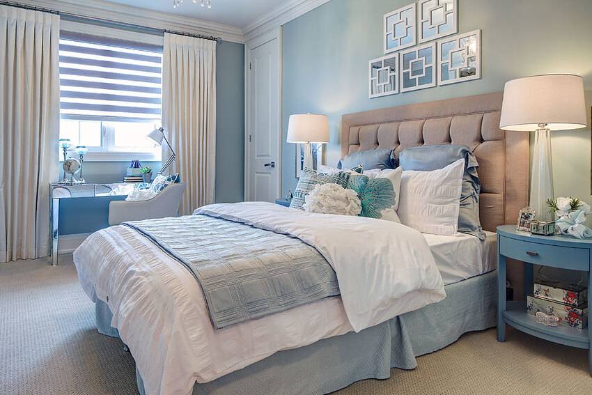 Бирюзовый и небесные цвета, лазурь или аквамарин станут хорошими компаньонами для карамельных, сливочных, телесных оттенков бежевого цвета. На фото голубой спальни можно увидеть, как расширяется пространство даже маленьких комнат с сохранением обволакивающего уюта.