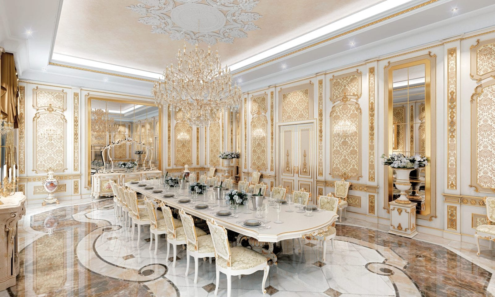 Для отделки помещения используют высококачественные декоративные виды материалов. Для оформления стен используют декоративную штукатурку, бумажные обои с ярким золотистый принтом, гипсовую лепнину.