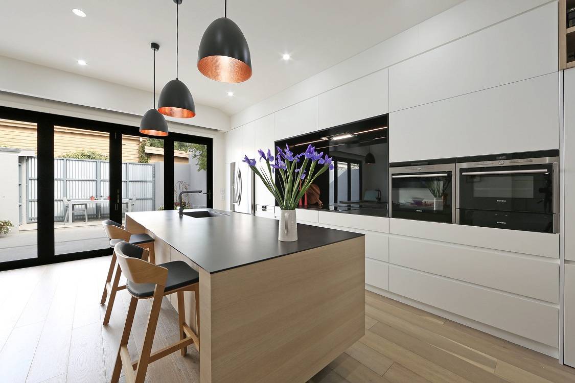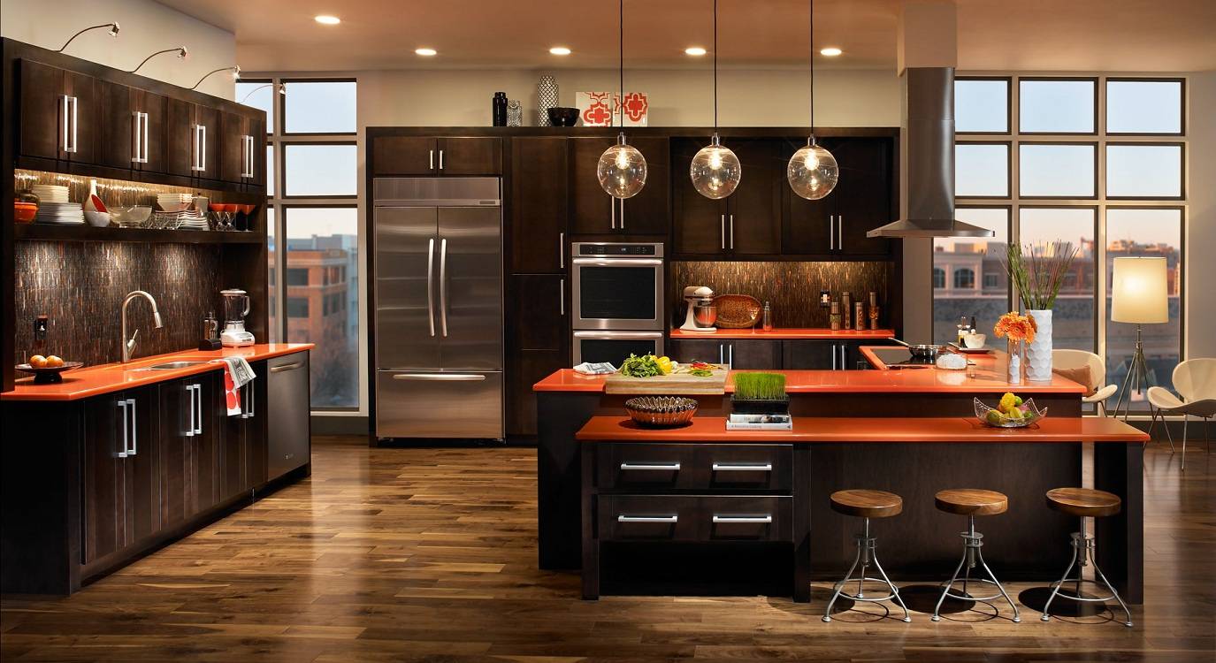 Итальянцы называют стиль контемпорари «moderno», что в переводе значит «современный». Его принято считать довольно популярным и широко доступным. Именно поэтому в качестве отделочных материалов для контемпорари выбирают продукцию массового производства. Конечно, для напольного покрытия для такой кухни можно использовать и паркет, однако в данном случае это будет излишеством. Качественный водоотталкивающий ламинат или линолеум – оптимальный вариант для кухни в стиле контемпорари. Также с успехом используют технологию наливных полов.