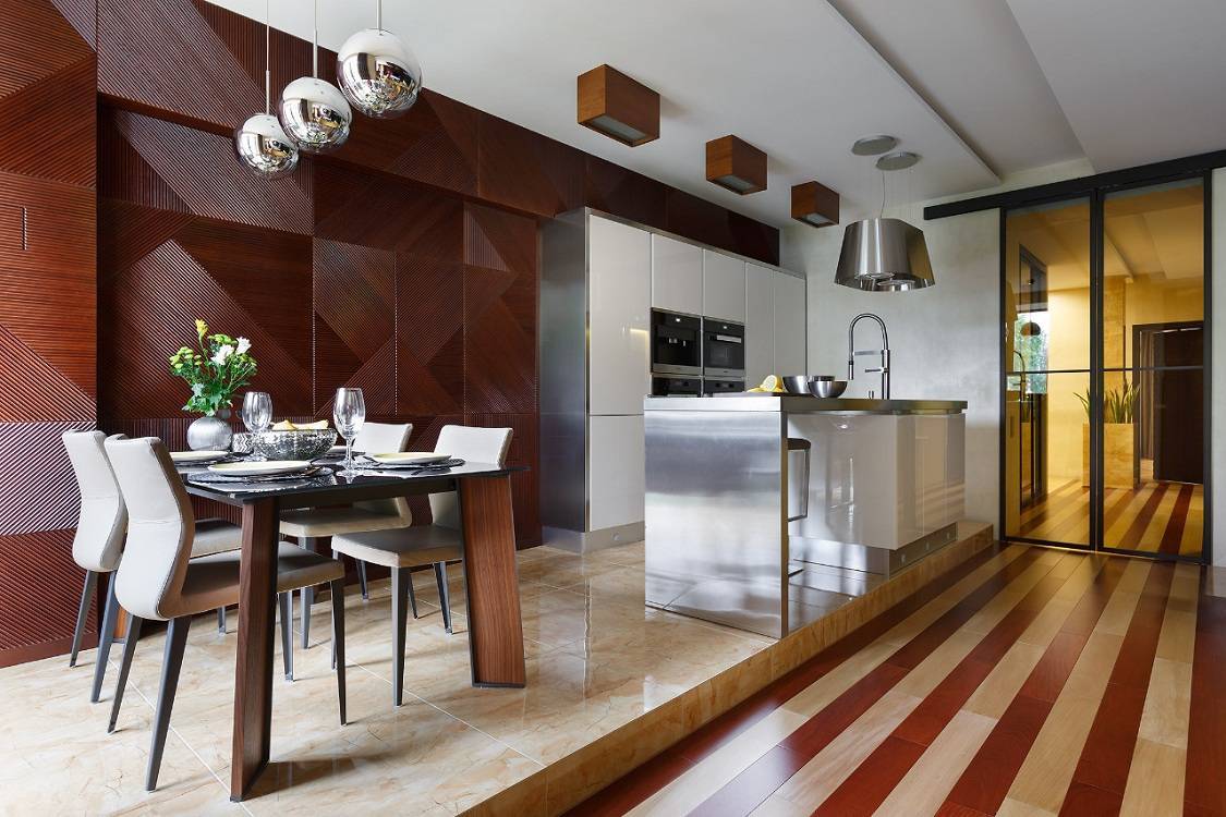 Если позволяет площадь, то кухню в таком интерьере объединяют с гостиной, разделив барной стойкой. Для обозначения зон можно использовать и разные покрытия на полу, и потолочные конструкции, и стеклянные занавеси. Встроенная техника на кухне, оформленной в этом стиле, просто необходима. Лишнего ничего нет, только то, что имеет практическую ценность.