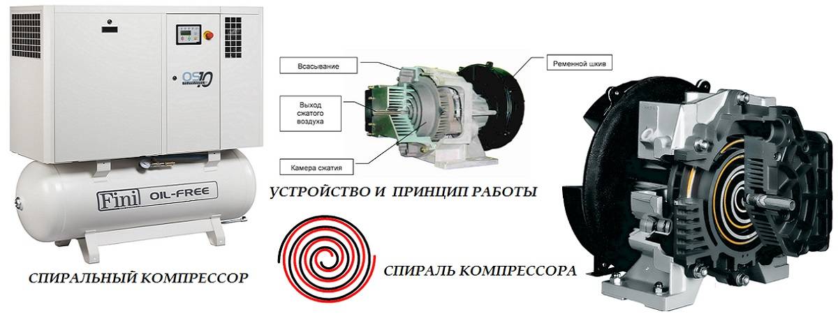 с двумя спиральными элементами, один из которых стационарный, другой является подвижным контуром. При вращении одной из спиралей возникают карманы, объем которых уменьшается при повышении скорости оборотов. Газ, находящийся в отсеках, сжимается и на выход подается нужного давления;