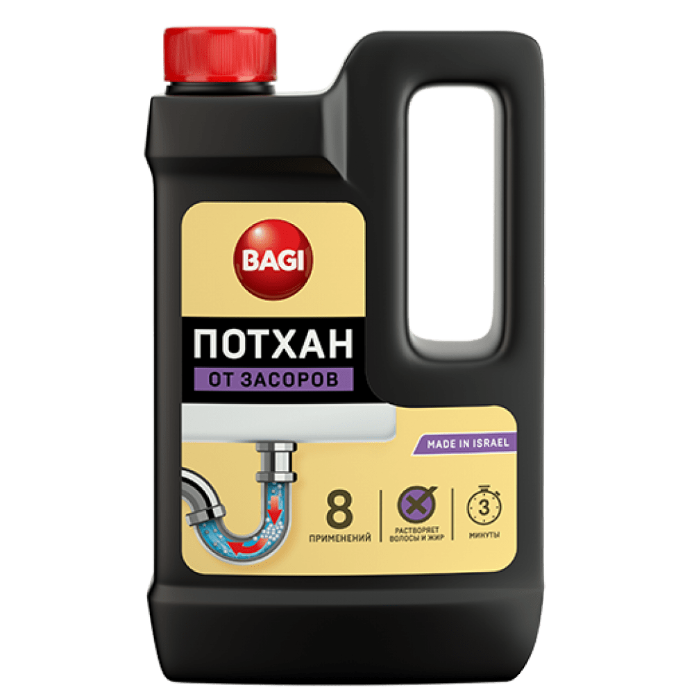 Bagi Потхан – средство для прочистки труб в гранулах. Даже сложные отложения, состоящие из жира, остатков пищи, бумаги, подгузников, полиэтилена и волос, препарат способен устранить в рекордно короткое время. Гранулы запрещено смешивать с другими химическими реагентами и оставлять больше, чем на 3 минуты.