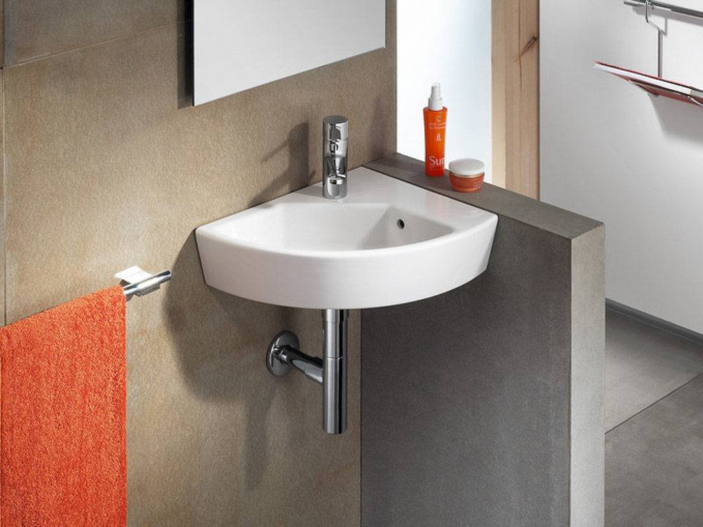 Как понятно из названия, этот тип подвесной раковины приспособлен для установки в углу — основание для крана размещено в ней в углу, а боковые стороны раковины должны прилегать к двум сходящимся стенам ванной комнаты.