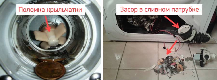 - Осмотрите механизм помпы на засоры. На крыльчатку часто накручиваются нитки и волосы, что блокирует ее работу. Удалите весь мусор.