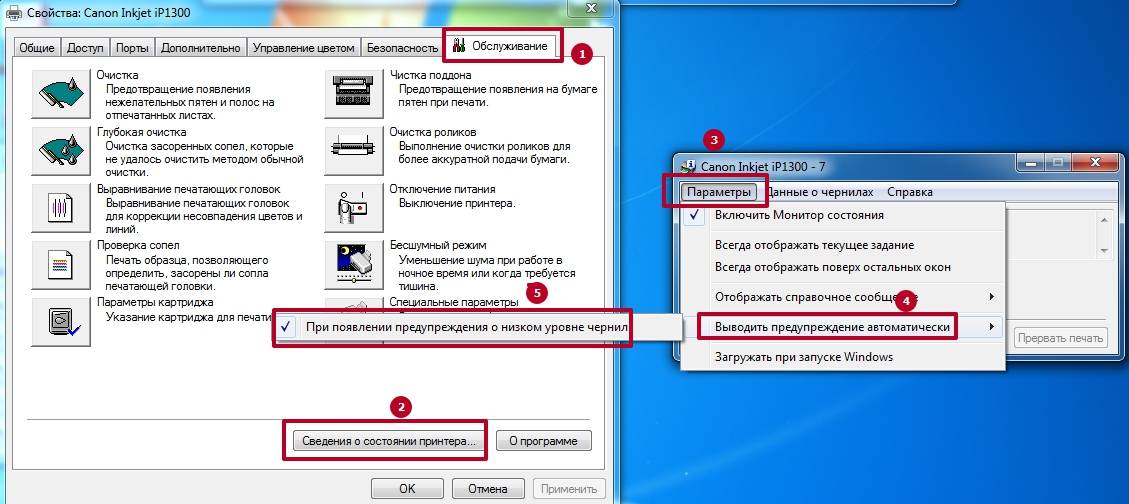 Перейдите на закладку «Обслуживание», потом нажмите на «Сведения о состоянии принтера», перейдите в «Параметры». Уберите отметку напротив «Выводить предупреждение автоматически».