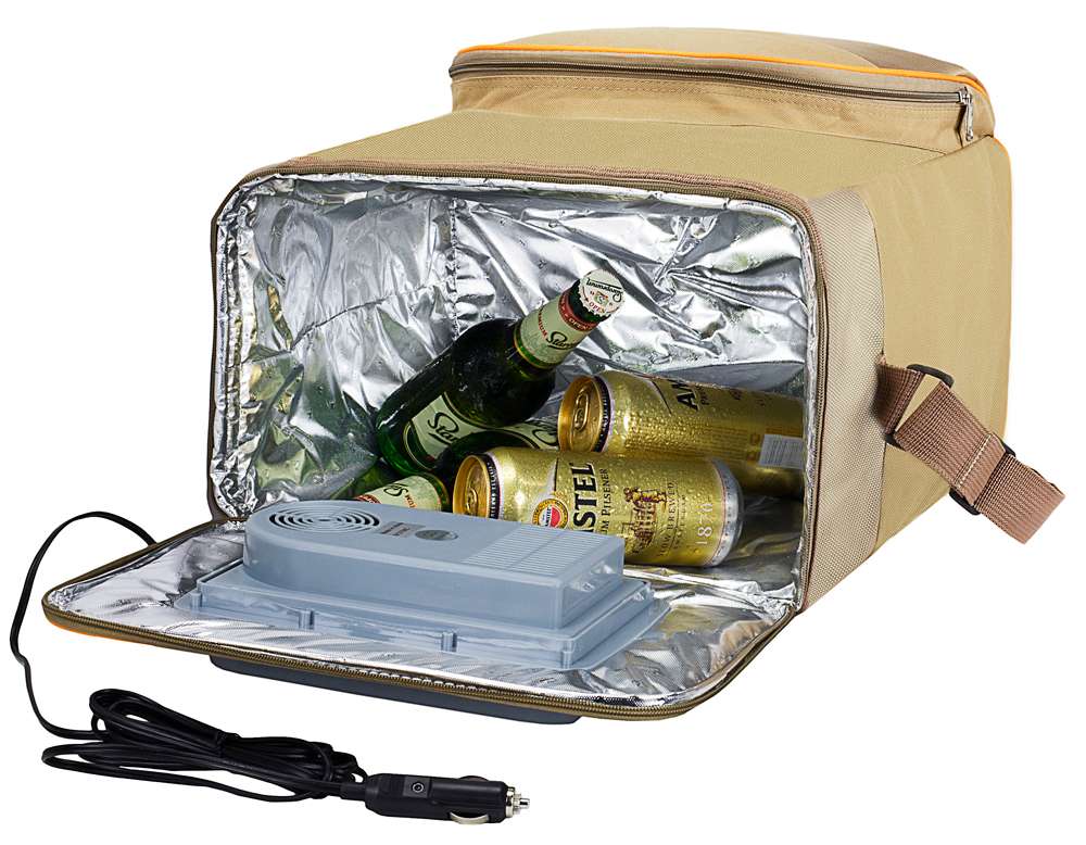 - Автохолодильник — наиболее емкий, самый дорогой и эффективный вариант сумки-холодильника. Представляет из себя мини-холодильник, который подключается к внешнему аккумулятору, либо напрямую через прикуриватель к батарее автомобиля. В автохолодильнике могут сохранять свежесть гораздо дольше, чем термосумка, благодаря активной работе охладительных элементов.