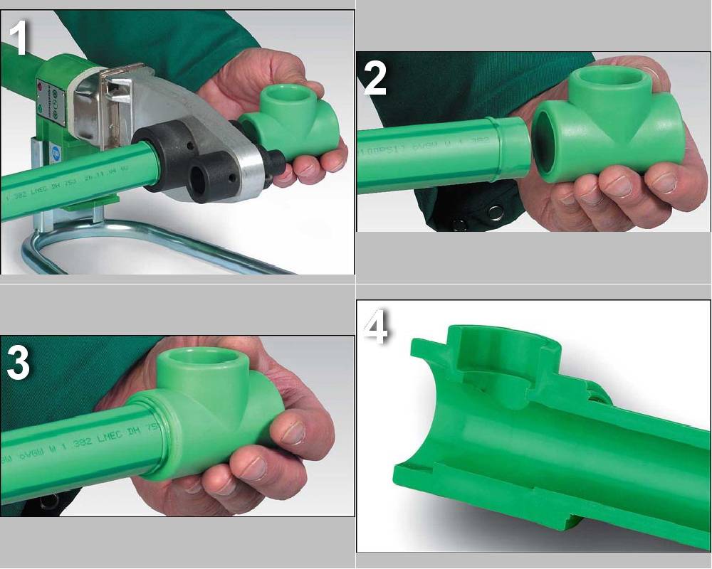 В бытовых условиях пайка полипропиленовых фитингов и труб в единую конструкцию чаще всего выполняется методом термической полифузии. После нагрева специальным прибором трубы быстро соединяются. Работы, в соответствии с технологией, выполняются поэтапно.