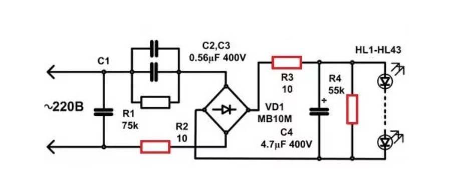 Чтобы защитить устройство от перепадов напряжения в начале схемы помещается резистор в 100 Ом, за которым впаивается конденсатор 400 нФ, после него устанавливается диодный мост и еще один резистор на 230 Ом, за которым идет собранная цепочка светодиодов.