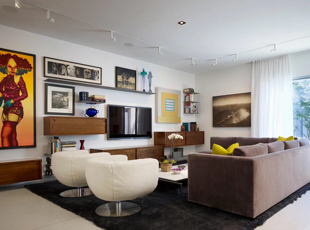 Расположение телевизора в гостиной рекомендуется на уровне от 120 сантиметров от пола. Именно на этом уровне находятся глаза человека, сидящего на диване или на кресле.