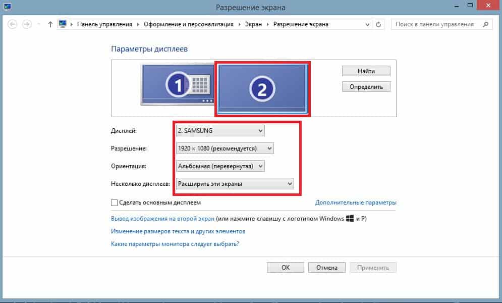 Для каждого монитора выставьте правильное разрешение, установите режим совместного использования: