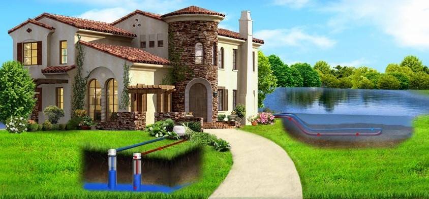 При соседстве с домом реки или пруда можно использовать тепловой насос, работающий по схеме «вода – вода». Для этого из водоема отбирается мощным насосом вода, которая прокачивается через первичный теплообменник теплового насоса, отдавая свою тепловую энергию фреону, и сбрасывается обратно в водоем.