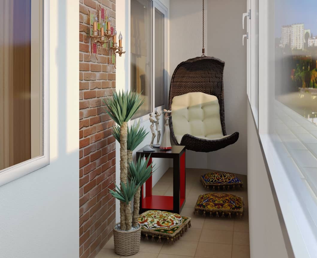 - лаунж-зона, в которой приятно отдохнуть вечером, любуясь ночным городом. Для реализации идеи потребуется подвесное кресло, большие или пуф, ковры и другой текстиль. Дополнит интерьер небольшой столик для напитков;