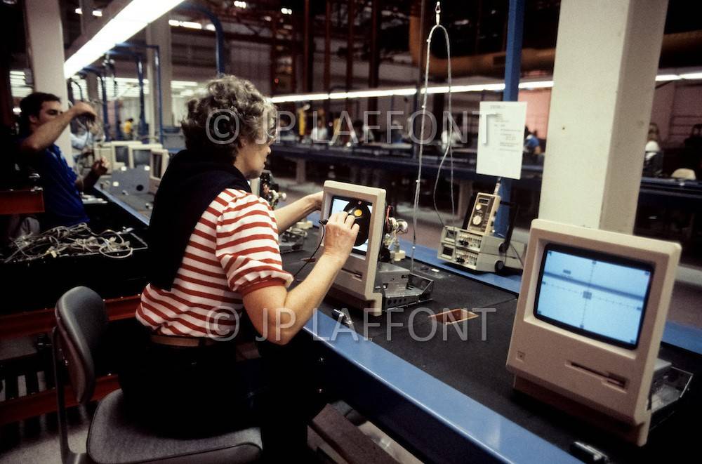 На фото сборочная линия компании Apple по производству первых компьютеров с графическим интерфейсом Macintosh 128K. Фотографии сделаны 25 января 1984 года. На второй день начала производства компьютеров на фабрике во Фримонте, штат Калифорния. Это потом б.