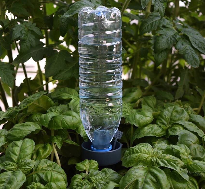 Внутрипочвенный капельный полив своими руками для дачи можно организовать с помощью специальных насадок продолговатой формы с отверстиями. Их можно купить в специализированных магазинах для дачников и садоводов. Насадка накручивается на горлышко тары вместо крышки. В этом случае следует использовать бутылки емкостью до 2,5 л, поскольку для тары в 5-6 л нет таких приспособлений. Бутылка горлышком вниз вставляется в землю на глубину насадки. Дно емкости можно не отрезать. После опустошения тары наконечник выкручивается, она заполняется водой, и манипуляция повторяется.