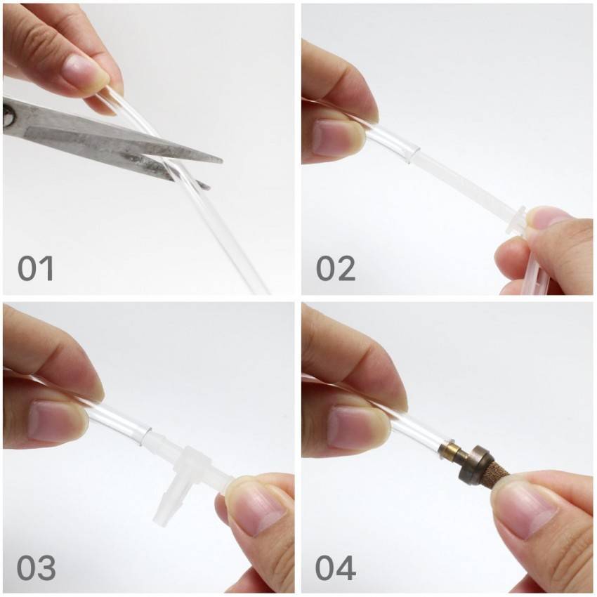 Тонкий конец штуцера до щелчка вставляется в жесткую трубу. Затем трубу необходимо поджать в месте вставки. Это делается с помощью пластиковой гайки на штуцере. Специальные инструменты для затяжки не нужны – данную операцию легко провести вручную.