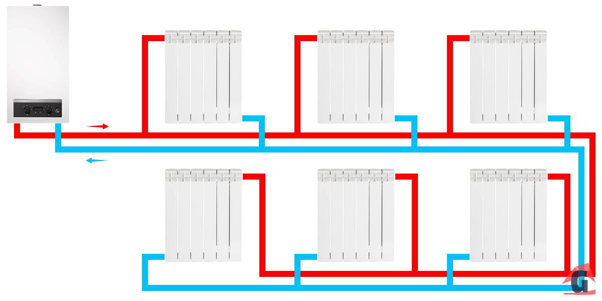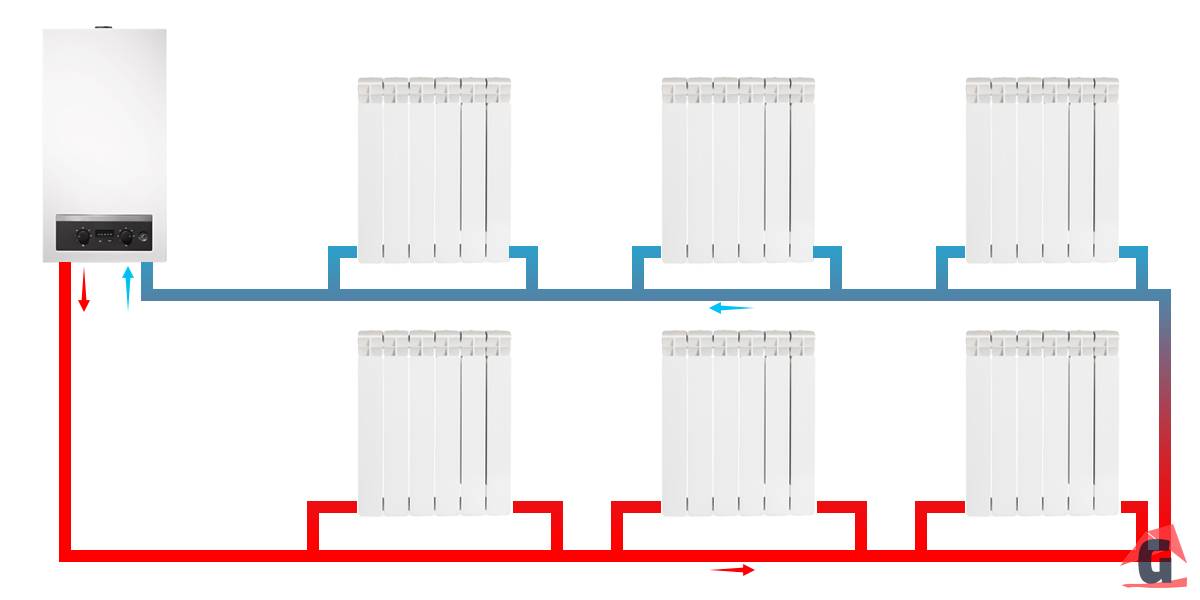 Двухтрубные разводки обеспечивают равномерный прогрев всех радиаторов. Не придётся увеличивать мощность котла и потребление энергоносителей, так как в самой дальней комнате температура поддерживается на нужном уровне.