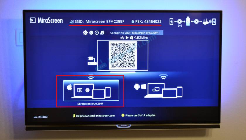 Значит наш адаптер подключен, включен и настроен. Он должен быть подключен к той же Wi-Fi сети, что и наш iPhone, или другое устройство, с которого мы будем делать повтор экрана. Если адаптер не подключен к роутеру, или роутера нет, то нужно наше iOS или Mac OS устройство подключить напрямую к Wi-Fi сети самого адаптера. Имя сети (SS >(см. фото ниже) .