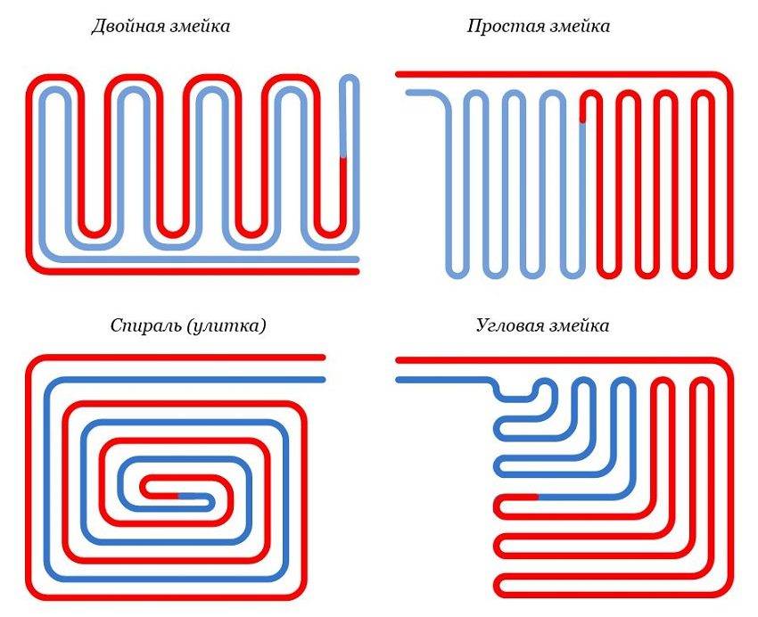 Варианты укладки труб: простые, угловые или двойные петли (змейки), спирали (улитки). Для узких коридоров и помещений неправильной формы используют укладку змейкой. Большие площади разбивают на сектора. Допускается комбинированная укладка: в краевой зоне труба выкладывается змейкой, в основной части — улиткой.