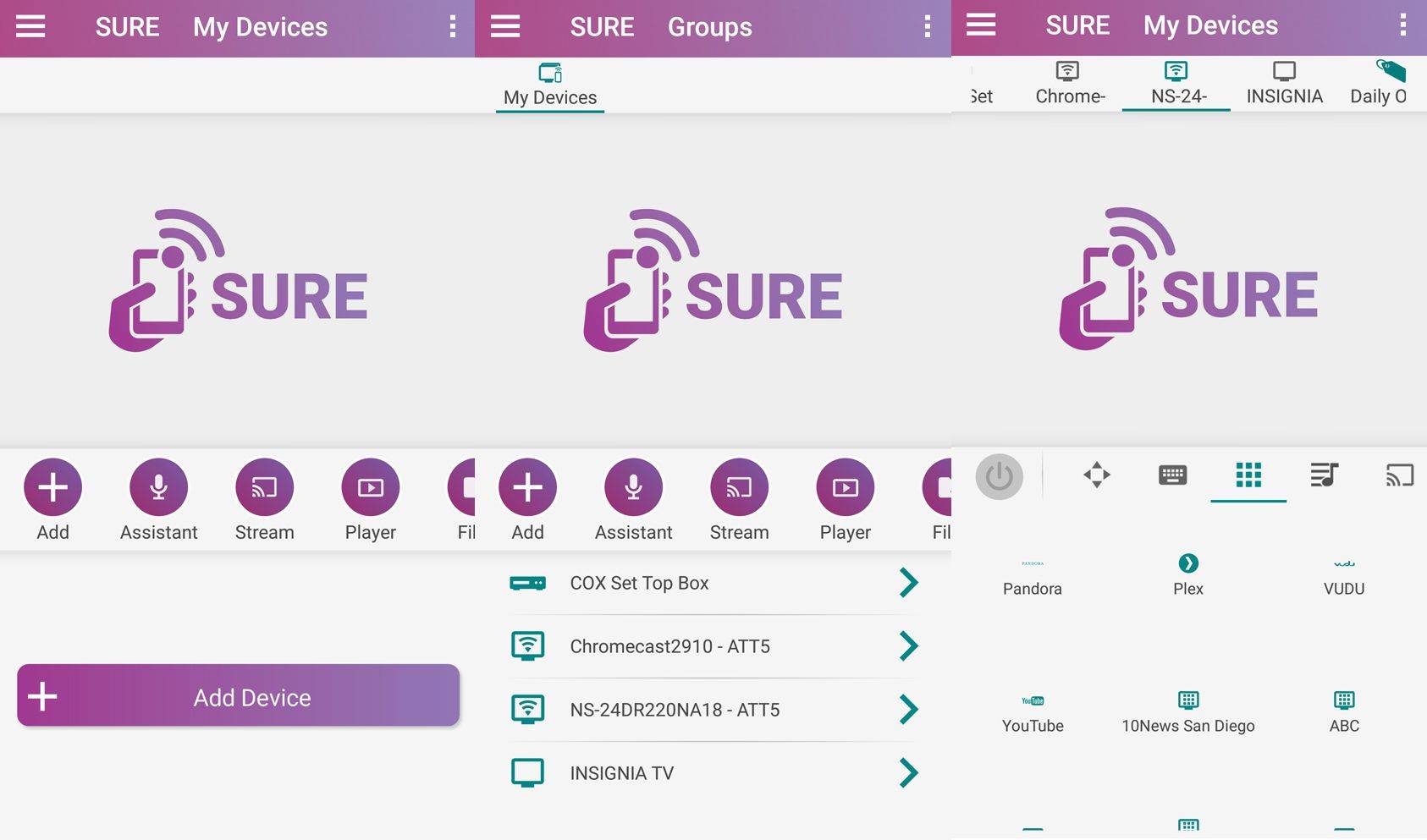 Благодаря ИК и Wi-Fi поддержка Sure Remote может управлять большинством домашних кинотеатров и умных домашних устройств. Это включает в себя телевизоры, кабельные / спутниковые приставки, домашние кинотеатры, Blu-Ray / DVD-плееры, медиа-стримеры и многое другое.