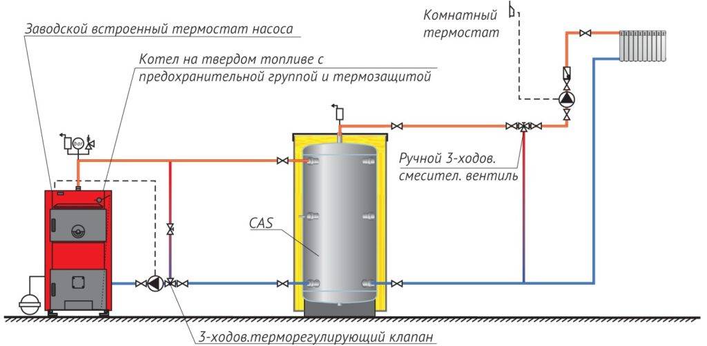 В закрытых системах отопления буферная емкость выполняет роль защиты. Подвод от котла выполняется самотечным типом. Когда останавливается насос, а котел при этом горит, то избыток тепла поступает в буферную емкость.