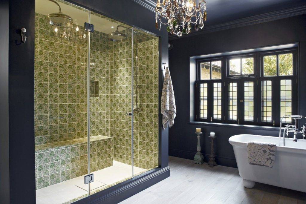 Стенки кабины могут выглядеть продолжением основной стены ванной комнаты, с естественными угловыми переходами и с единым кафельным покрытием. Основу таких ограждающих плоскостей возводят из кирпича или из влагостойкого гипсокартона.