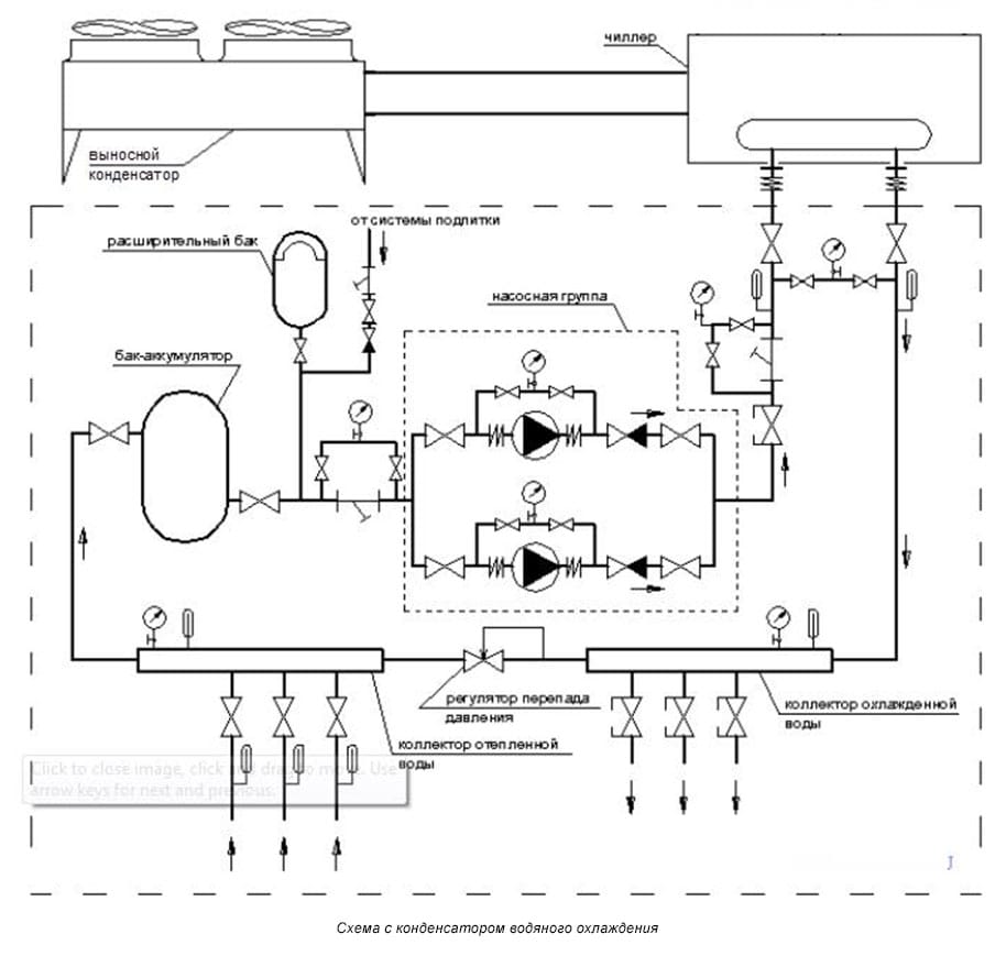 Также важно понимать, что при таком подключении длина трассы от чиллера до выносного конденсатора весьма ограничена. Перепад высот также должен быть небольшим