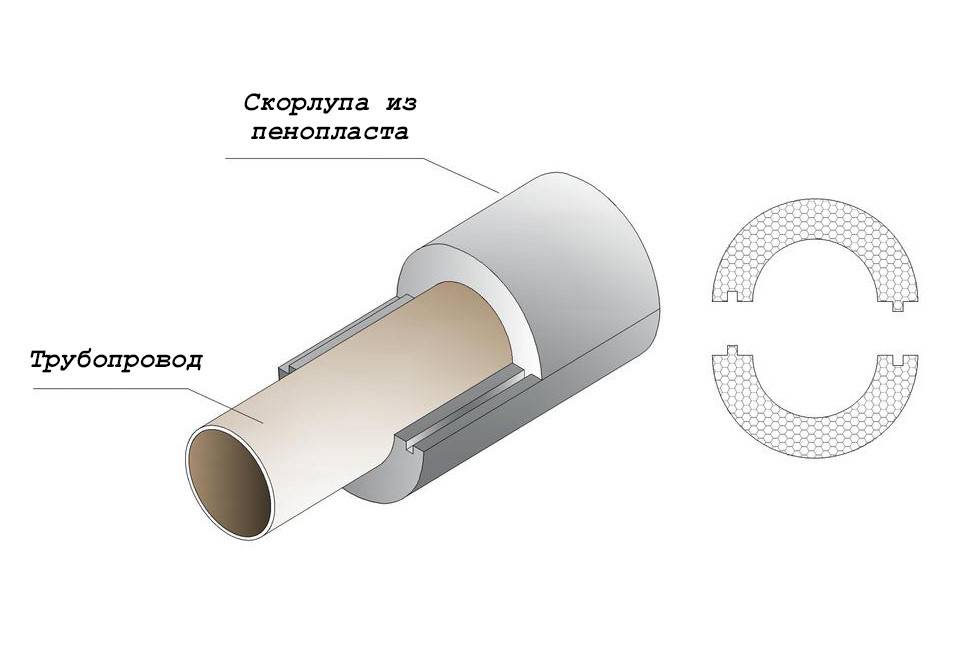 Скорлупы из пенопласта для утепления водопроводных трубжесткие (теплоизоляционный кожух для труб – скорлупа из пенополистирола (ППУ) или вспененного пенопласта. Цена от 190 руб/м.п, зависит от толщины и диаметра цилиндра);