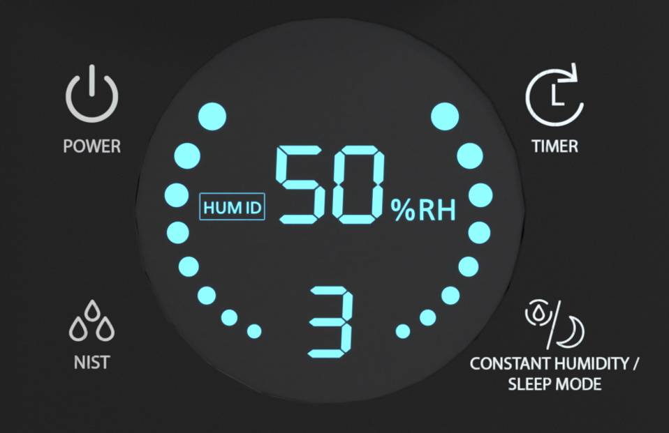 В увлажнителе предусмотрены индикаторы уровня воды и включения. Управлять девайсом можно через сенсорный дисплей, на котором отображаются все настройки.