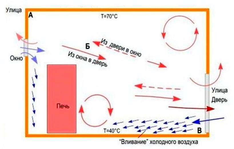 Замещение воздуха в помещении происходит благодаря постепенному подъему подогретых воздушных масс вверх к потолку в направлении вытяжного отверстия, выведению их наружу и поступлению аналогичного объема холодного свежего тяжелого воздуха с улицы через приточное окно.