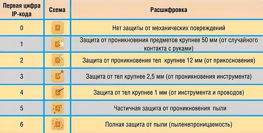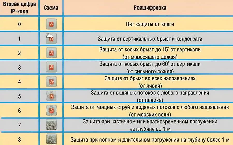 Уровень защиты от попадания вовнутрь корпуса влаги указывает вторая цифра маркировки.