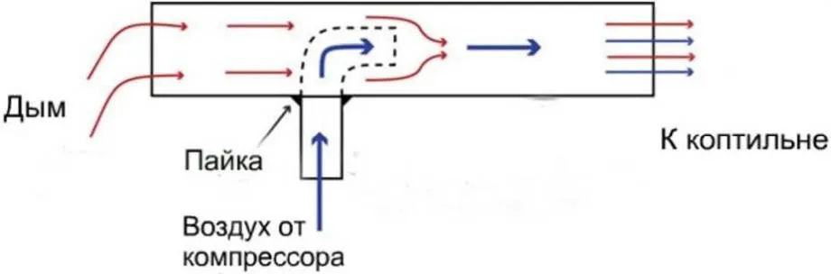 - Когда эжектор смонтирован внизу, несгоревшие частицы топлива попадают в дымоход. Приходится увеличивать длину дымохода, чтобы температура в коптильной камере была подходящей (не чрезмерно высокой).