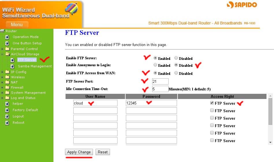 Перед тем, как приступать к настройке видеосервера, нужно будет настроить сам роутер. Для этого потребуется зайти в меню настроек и найти специальную вкладку – FTP-Server. Если брать в качестве примера роутеры бренда Sapido, то можно найти такую вкладку в разделе AirCloud Storage. В большинстве случаев используется следующий адрес: 192.168.1.1. После того, как роутер настроен, можно заниматься видеосервером.