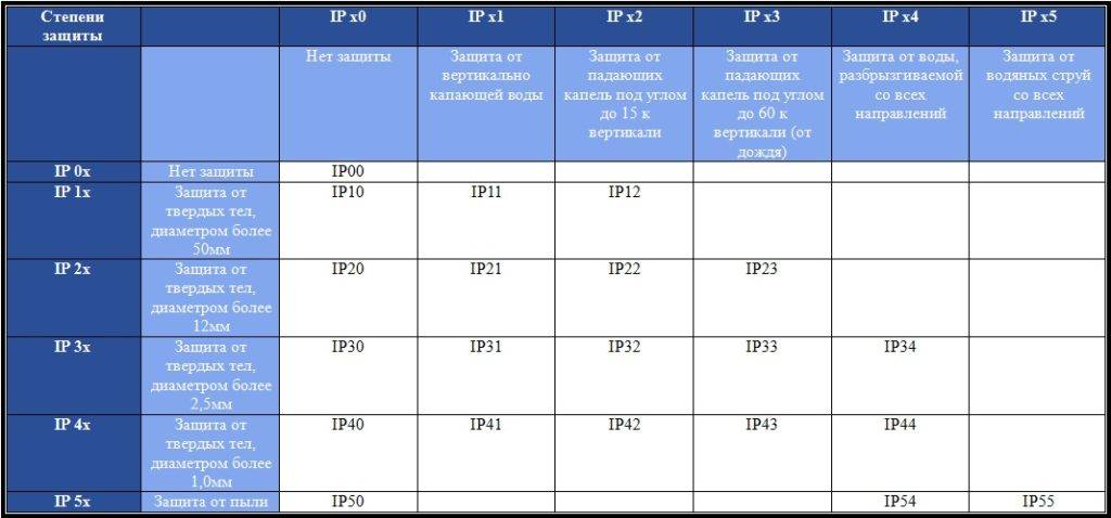 Первая цифра означает защищенность изделия от попадания в него посторонних предметов извне. Эти предметы имеют любой размер, вплоть до размера частиц пыли. Вторая цифра означает степень защищенности от влаги. Чем больше цифры – тем выше степень защищенности.