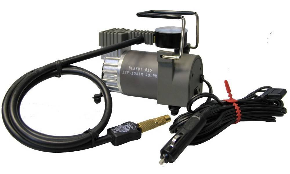 Компрессор питают от прикуривателя. Он может работать непрерывно около 30 минут. В него встроен стрелочный манометр. Кроме того, комплект оснащен дополнительными переходниками.