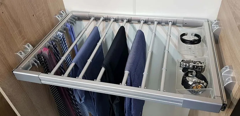 - Брючницы – нельзя не отметить, ведь они позволяют правильно хранить брюки и джинсы, предоставляя лёгкий доступ к этим предметам одежды. Этот элемент наполнения шкафа фиксируется к последней или полке сбоку.